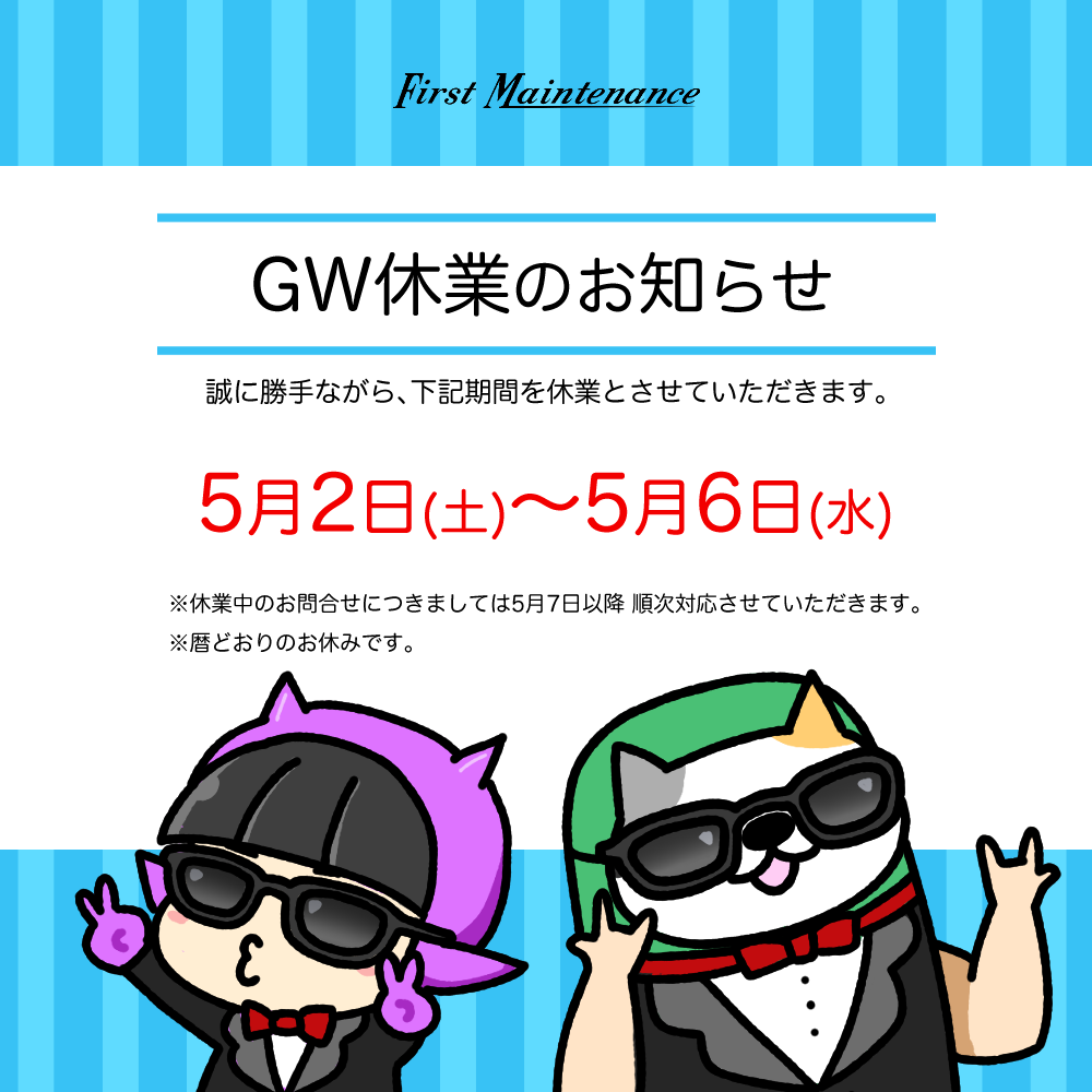 弊社では、誠に勝手ながら下記日程をゴールデンウィーク休業とさせていただきます。